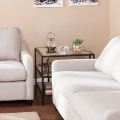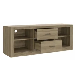 Featuring a two-tone finish and extensive storage space, the Rikke TV stand unifies style and function. Constructed from solid particle board, the Rikke features two open shelves to store DVD players, game consoles, and more. One circular cut-out behind the shelves enables easy concealment of cables and wires. Additional storage space is provided by two spacious drawers and a concealed shelf behind a door. A two-tone gray and walnut brown finish are paired with long, vertical brown PVC handles to give this piece a cool, contemporary feel. The Rikke TV stand is made in Malaysia and requires assembly. Dimensions: 17.1″ High x 70.9″ Wide x 15.7″ Deep; Drawer: 3.1″ High x 21.8″ Wide x 14″ Deep; Shelf: 6″ High x 22.8″ Wide x 14″ Deep; Legs: 1.2″ High