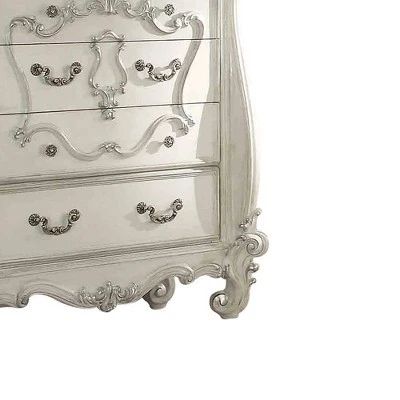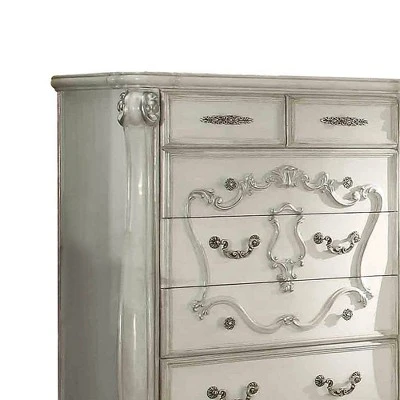 The Versailles chest is the perfect accent to create the style of royalty your bedroom has been needing. This chest crafted in wood with bone white finish was inspired by old European design with brown copper metal hardware and intricate wood carvings on the front of the five drawers. This chest will offer up more than enough room for you to keep clothes organized and off the floor. Made from engineered wood, this chest is finished in a neutral laminate for a look that fits into any style.
