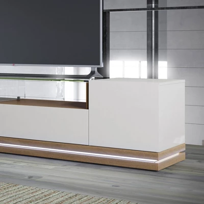 The freestanding Vanderbilt TV Stand is an elegant choice for your contemporary space, featuring a beautiful tempered glass stand to fit up to an 80” screen and components. It includes 2 doors, 2 full extension drawers, 2 open shelves, and the option for LED lighting around the stand. In your choice of White Gloss, Maple Cream-Off White, Nut Brown, and Black with Pro Touch. The unique paint is protected by the Microban Antibacterial Protection.
