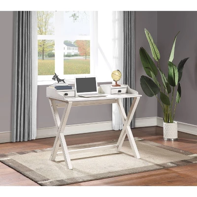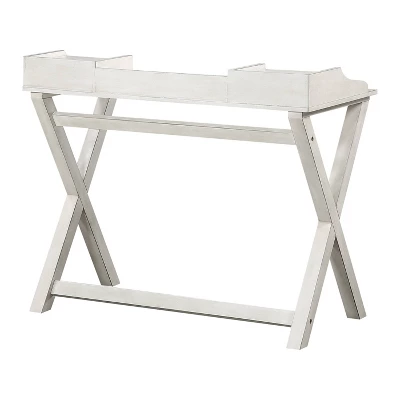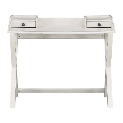 The perfect place to catch up on emails, pay bills, or just jot down a quick list, the Barton Writing desk anchors your office space or family command center. Lovely features like, contoured low rise hutch with gallery rail, and the X-frame trestle base create a striking silhouette. The two drawers with rustic iron pulls keep your supplies tidy. Built with beautiful and durable birch veneer, this desk is quick and easy to put together with a simple 8-bolt assembly.