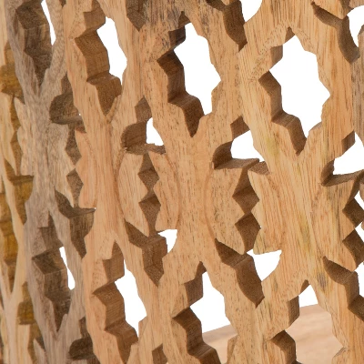 Skilled craftsmen in India create the intricate Brinley Round End Table. With a rosette pattern on two sides of its circular frame, the table provides visual appeal and storage. With a luxurious natural stain on mango wood, it is a magnificent way to add tone and texture to your space. Your purchase includes one end table.
