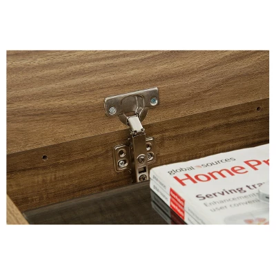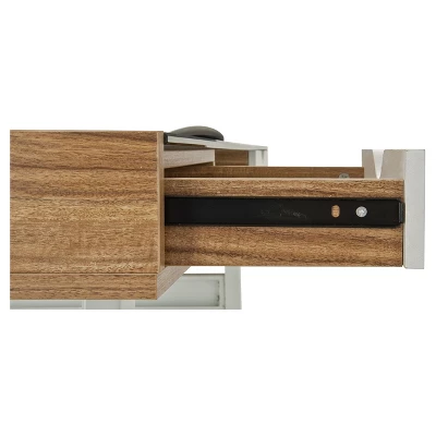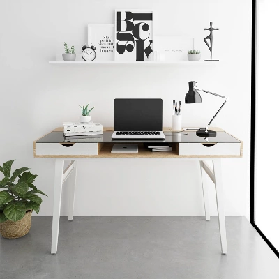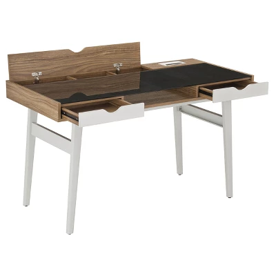 This Techni Mobili Computer desk has a stylish and unique design that compliments any modern office or room décor. It features 2 drawers and an open shelf compartment in between, to store stationary papers, calculator and other small essentials. The spacious desktop, made of a beautiful black tinted tempered glass, can easily accommodate a computer setup, while managing its cables through an accessible opening back compartment. This uniquely designed desk is made of MDF wood panel with PVC veneer atop white powder coated steel frame. This modern desk is an aesthetically pleasing option and perfect for keeping cables off the floor, where they can become damaged, or create a trip hazard for foot traffic. Color: Walnut