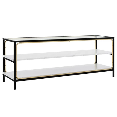 Black matte and gold glossy steel tubes create a sturdy and classic structure with strong load capacity of 198lbs. Together with wavy tempered glass top and 2 faux marble shelves, the TV stand presents a more impressive and elegant look. What’s more, its spacious countertop is perfect for a TV up 50 inches while 2-layer shelf is an ideal storage addition. Since glass top is supported by silent pads, there is few frictions and noises during the use. Its anti-slip pads effectively avoid scratches on the floor. Overall, it is a clever combination of TV stand and display shelf, which only requires simple installation.