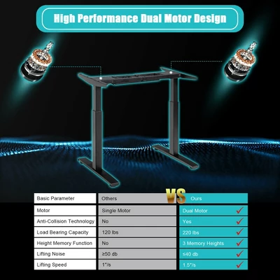 - Dual Motor Lift System: This electric standing desk frame is equipped with an intelligent push-button controller for easy operation. There are 3 preset buttons to customize your desired heights. Dual motors offer more smooth height adjustment at a speed of 1.5”/s with lower noise under 45db while running.