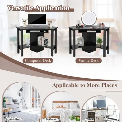 This is our new corner computer desk which is a compact and functional item. Be made of wood ,it is sturdy and durable . Corner design help you maximize your limited floor area. It has a large opening drawer to store your keyboard, And two opening storage space underneath for host computer , miniprinter, books ,CDs and so on. Can be used as study desk, office desk, home office desk workstation and computer desk. This desk compliments any room and is a great addition to any home office