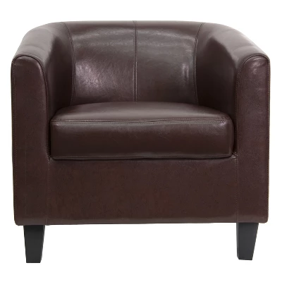 Establish a professional rapport with your clients when they enter your lobby by offering them a place to sit on this classic guest chair. The barrel back design and sloping arms provide comfort while engaging in business meeting or casual discussions. This lounge chair is straight to the point in its overall design offering up clean-line stitching and a fixed seat cushion to keep your seating in immaculate condition. With its classic design this guest chair is ideal in professional offices, cigar lounges, lobbies, conference rooms, or sitting room to lounge and relax in your home. Additional Features: Fixed Seat Cushion, Dense Foam Padded Seat, CA117 Fire Retardant Foam, Solid Inner Hardwood Frame Construction, Wooden Legs, LeatherSoft is leather and polyurethane for added Softness and Durability