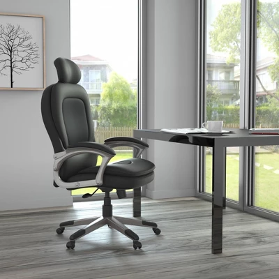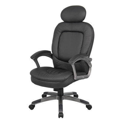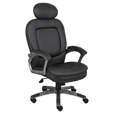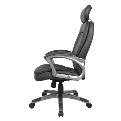 Our high back executive chair features a patented perforated pillow top design and is beautifully upholstered with impeccably soft, durable Caressoft upholstery. Additional features include a tasteful pewter finish, padded armrests, and comfortable cushions. Structurally, the chair has an upright locking position, pneumatic gas lift seat height adjustment, and adjustable tilt tension control. Of course, all of this is supported by a sturdy 27” nylon base that is propped up by five hooded double wheel casters.