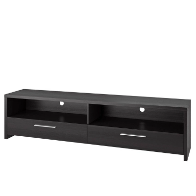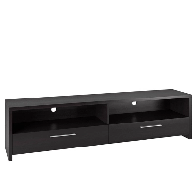 Upgrade your home theater with the TV media stand from the Fernbrook Collection. The wide surface is practical for a mounted or sitting TV. Available in our black faux wood grain finish and accented with metal aluminum handle pull. This bench is a beautiful combination of open and concealed storage space and is built to accommodate most TVs up to 95 inches, a great addition to any living room or entertainment space