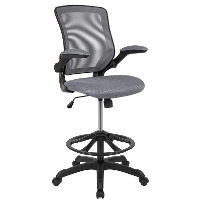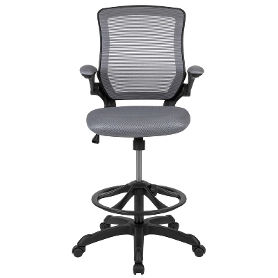Be proactive at work when you roll this high office chair into the office to accompany your high desk. The high desk chair pairs well with sit-to-stand desks, standing desks, bar height tables and drafting tables. This ergonomic mesh back drafting chair allow employees working with the public to be at a comfortable eye-level when their work surface is above standard desk height. Enjoy the comforts of an ergonomic chair in a taller frame to meet the needs of students and professionals working at above average desk heights. The curved back cradles you while offering built-in lumbar support. Designed with your comfort in mind, this drafting stool features a pressure relieving waterfall edge seat and flip-up arms to relieve pressure off your shoulders and neck. Pull the tilt lock out to recline and rock or push in to lock in an upright position. The frame is outfitted with a stylish height adjustable foot ring. Draft chairs are essential for any profession where work surfaces are above standard height, such as lab technicians, receptionists, architects, graphic artists, or any other creative assignment. With the ventilated mesh material, you’ll be kept at a cool temperature throughout the day on this draft chair to complete your tasks. Additional Features: Padded Upholstered Seat with CAL 117 Fire Retardant Foam, Waterfall Seat reduces pressure on your legs, Pneumatic Seat Height Adjustment, Height Adjustable Nylon Foot Ring, 5-Star Nylon Base with Dual-Wheel Casters