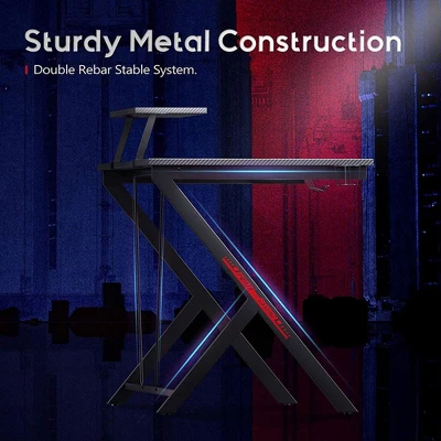 Game like a pro even in the smallest of spaces with the MOTPK Carbon Fiber Computer Gaming Desk with Raised Monitor Shelf. This gaming desk is the perfect solution for gamers who want a full PC setup in the apartment, dorm room, studio, and more. Perfect for gamers and active computer users, this desk has an array of features that provide style and unbeatable convenience. The sturdy Y-shaped metal frame with wire reinforcements keeps the desk stable while leaving enough room for your legs and to store your PC computer. Measuring 39-inches, the desk features a raised monitor shelf that holds up to 3 monitors while still fitting in a small space.A built-in cupholder, headphone holder, and cable holes provide luxury convenience that makes it easy to keep your hands on the controller or keyboard. The carbon-fiber desktop provides a sleek look and is waterproof and resistant to wear, allowing you to enjoy this stylish desk for years to come. Adjustable feet allow you to adjust the height of the desk to fit your frame comfortably.Don’t compromise because of a lack of space. Enjoy gaming on the MOTPK Carbon Fiber Computer Gaming Desk.