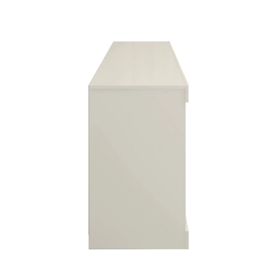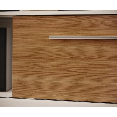 Create an elegant modern set up in your living room, lounge, or bedroom with this expertly crafted TV media entertainment center console. Inspired by the contemporary style with a hint of Scandinavian aesthetic, it features plenty of space for your media devices with its five open cubbies and a sliding door. Clean lined and minimalistic, it is handcrafted from a premium quality composite wood frame. The subtle white accented frame complements the oak brown coated door panel. With a metal rail that facilitates ease of use for the sliding door, the subtle wood grain details on the door panel impart a nature inspired appeal to the piece as a whole. This classic centerpiece will be a beloved companion for years to come.