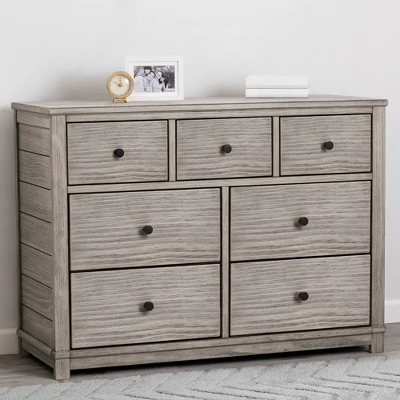 The best of both worlds, the Monterey 7 Drawer Dresser by Simmons Kids effortlessly combines style and storage. Its rustic finish showcases a textured grain to achieve a natural weathered feel and look that will outfit any room with farmhouse charm. Shiplap-inspired detailing on the sides adds a contemporary touch. A great dresser for your baby’s nursery, kid’s bedroom or even your master bedroom, it features three small drawers on top and four larger drawers below to ensure optimal storage space. The Monterey 7 Drawer Dresser by Simmons Kids is available in Rustic gray and Rustic White. To complete your room, pair this dresser with other items in the Monterey Collection. Given its handmade nature, variations in the hand-applied finish and wood grain are to be expected and celebrated.