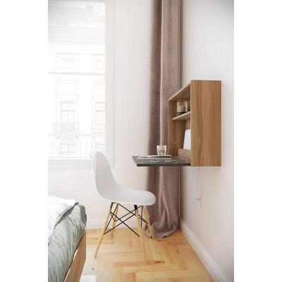 This small wall-mounted Slim floating desk offers a workspace with just one door opening! To be placed at the desired height, this desk, with rectangular lines, allows you to work sitting as well as standing. This space-saving desk is scratch, stain, and water-resistant for your everyday purpose. Easy and quick to assemble.