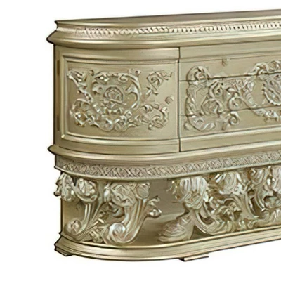 The Vatican Bedroom Collection employs a sense of timeless style in each piece, from button-tufted upholstery, scrolled floral accents to detailed design. Padded headboard and footboard showcase classic arched-silhouettes that are graced with crown, scrolled trims, and ornate engravings. Champagne gold-tone lends a sleek finishing touch to matching case goods. The Vatican Collection will infuse your bedroom with glitter and endless luxury.